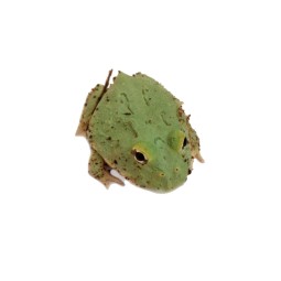 Duża, pięknie ubarwiona żaba. Jest mało ruchliwa, zazwyczaj przebywa w jednym miejscu, zakopana w torfie. Jej ugryzienie może być bolesne. Jest niezwykle żarłoczna. Ma charakterystyczne „rogi” nad oczami stąd też ich nazwa.