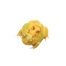 Duża, pięknie ubarwiona żaba albino. Jest mało ruchliwa, zazwyczaj przebywa w jednym miejscu, zakopana w torfie. Jej ugryzienie może być bolesne. Jest niezwykle żarłoczna. Ma charakterystyczne „rogi” nad oczami stąd też ich nazwa.