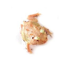 Duża, pięknie ubarwiona żaba albino. Jest mało ruchliwa, zazwyczaj przebywa w jednym miejscu, zakopana w torfie. Jej ugryzienie może być bolesne. Jest niezwykle żarłoczna. Ma charakterystyczne „rogi” nad oczami stąd też ich nazwa.